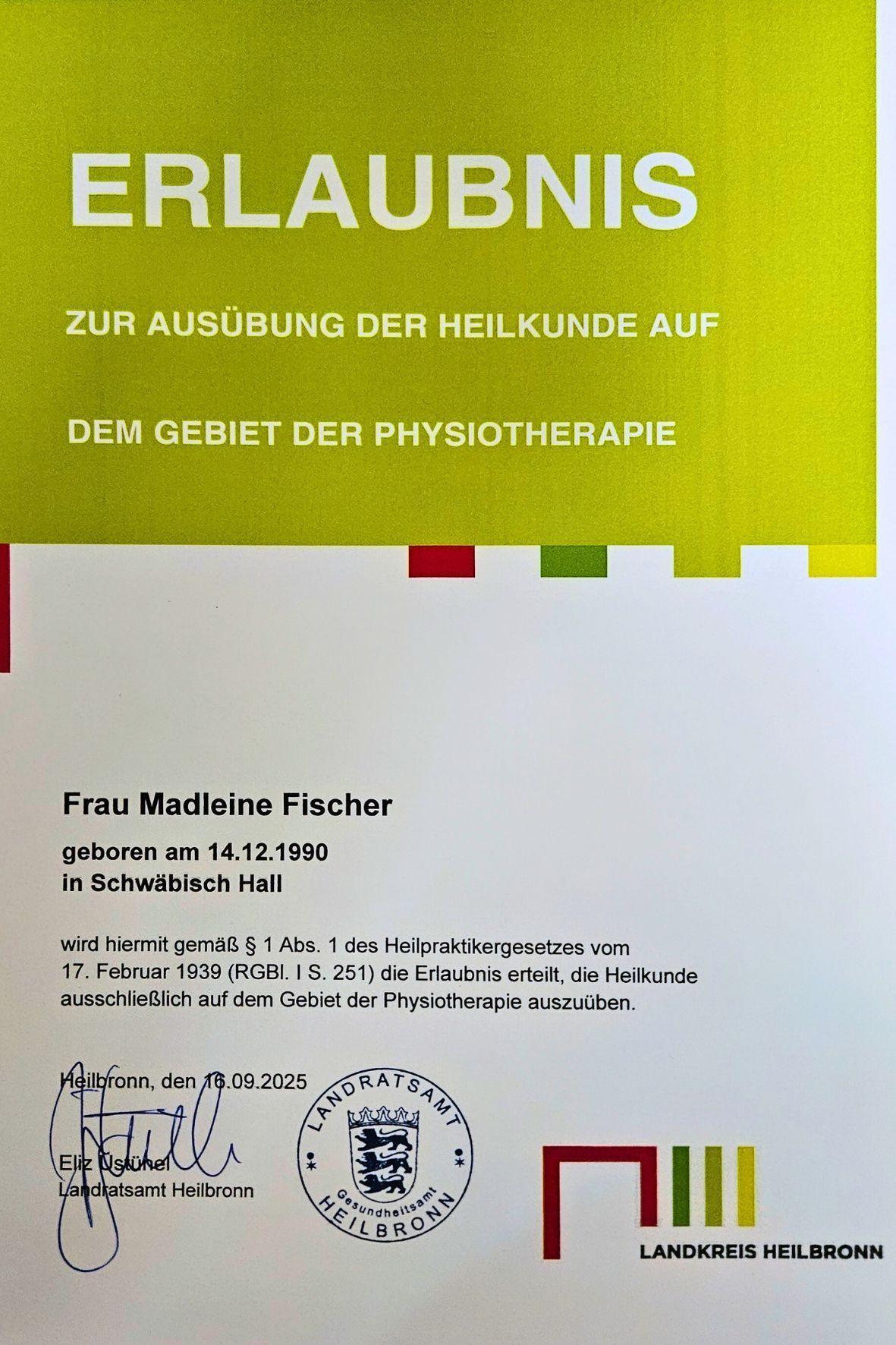 - 2025 Heilprakterin, sektorale Erlaubnis für Physiotherapie