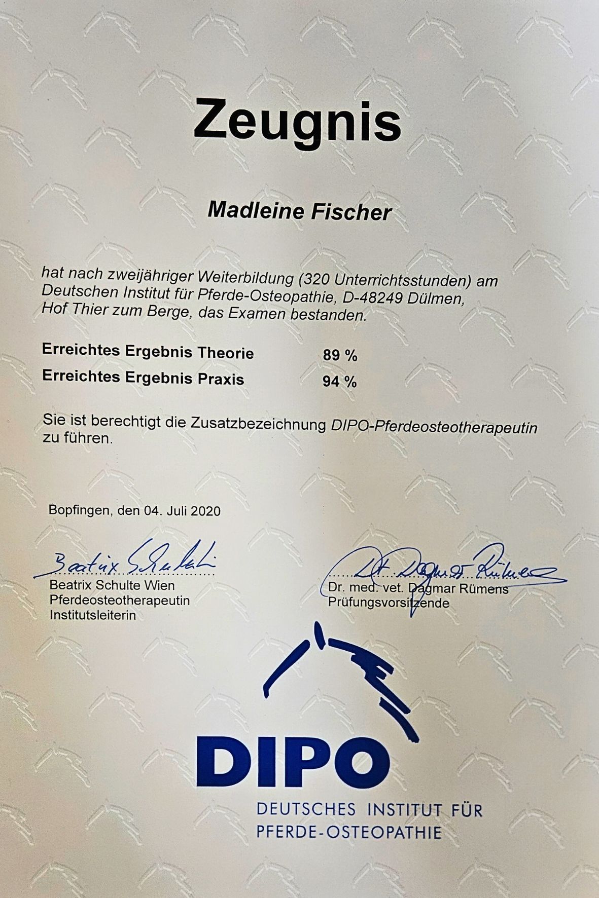 - 2018-2020 Weiterbildung und Prüfungsabschluss zur Pferdeosteotherapeutin bei der DIPO (Deutsches Institut zur Pferdeosteopathie) in Bopfingen